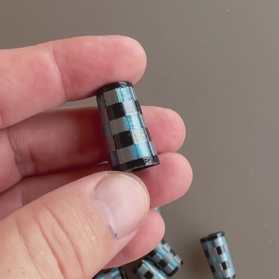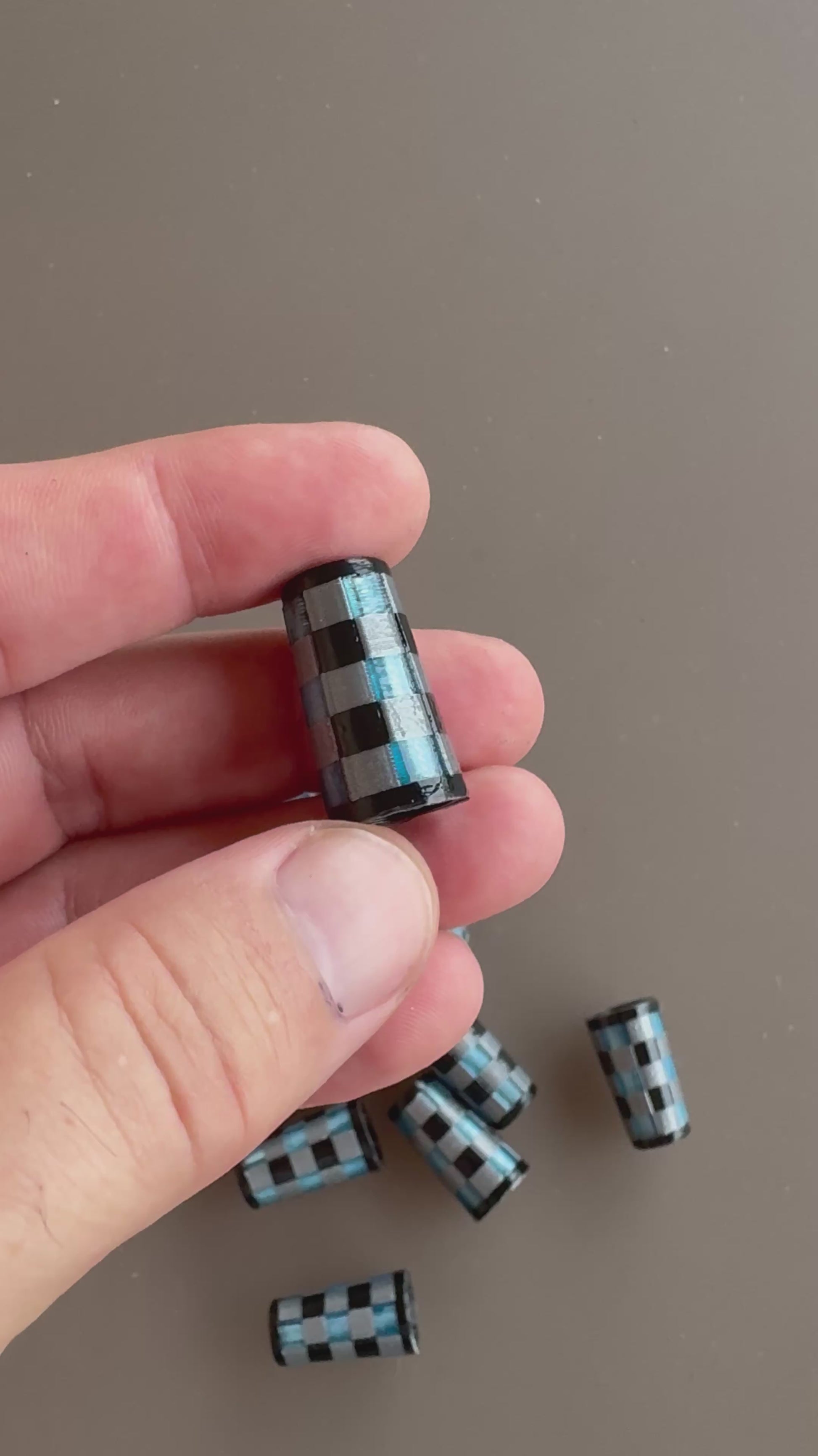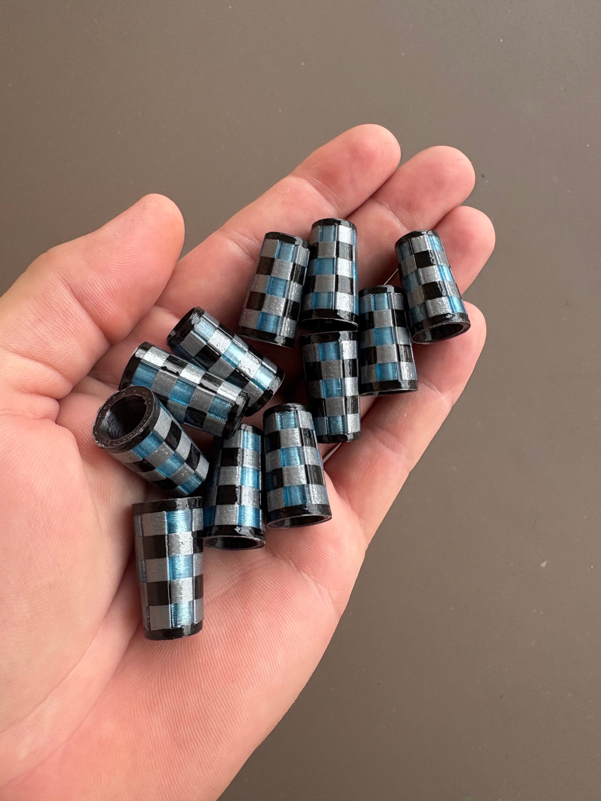 Black end caps, black, silver, and translucent blue checks. 3d printed in ABS.